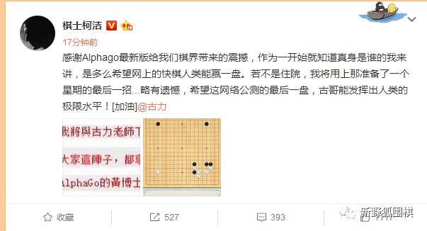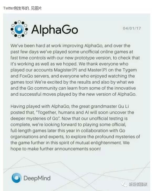 随后,AlphaGo在推特上发表了正式声明,公布Master就是AlphaGo的马甲,并感谢各位与之对弈的棋手和观战的棋友,特别是与之深入交流的古力九段。