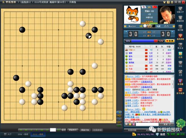 然而Master再次有惊无险的获胜。“最后一盘棋会和谁下呢?”棋友们纷纷猜测。此时腾讯围棋已经有160名职业棋手在线,金银冠级(世界冠军、全国冠军)棋手就有三十多位,天下英雄,尽入野狐中。