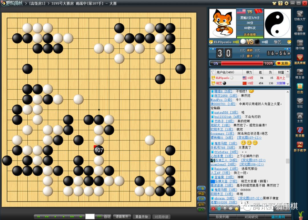 复赛前半程绝艺连遇强敌,继前一天击败预赛第2名、来自比利时的Leela Zero之后,本轮绝艺又遭到预赛第3名,由美国互联网巨头打造的ELF的强劲阻击。下午首局ELF执黑先行,开局第3手,ELF便以一记标志性的点三三,拉开这场中美AI峰会的序幕。